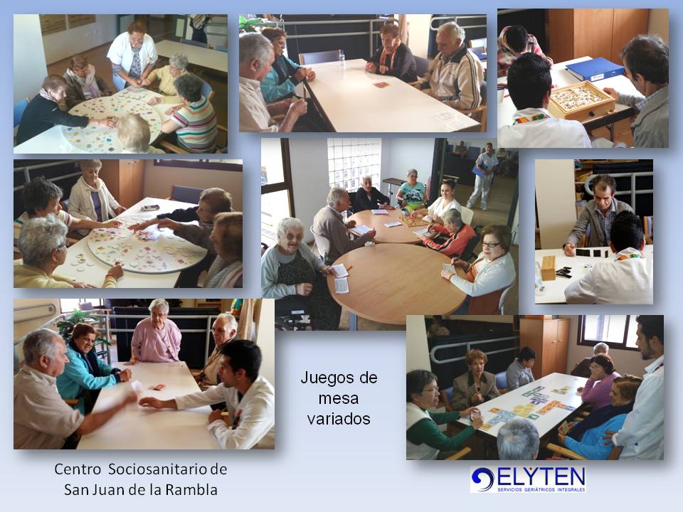 Los ¨Juegos de mesa¨ofrecen al ser humano un sinfin de habilidades, estimulan la participación, contribuye al desarrollo físico, cognitivo y social favoreciendo la comprensión de reglas y normas. También fomentan la concentración, la capacidad de asociación, agilidad mental y la resolución de problemas. Juegos de cartas, bingo, dominó o juegos modernos, todos valen a la hora de potenciar el ocio y tiempo libre. El Centro Sociosanitario de San Juan de la Rambla ¨ELYTEN¨, cuenta con amplio catálogo de juegos, en su mayoría, adquiridos especialmente para el colectivo de Personas Mayores (números grandes, diferentes texturas y colores llamativos). Cabe destacar que otro porcentaje de los juegos han sido donados desinteresadamente por el Personal Laboral del Centro. Muchas Gracias a todas y todos por sus aportaciones... y a seguir jugando!!