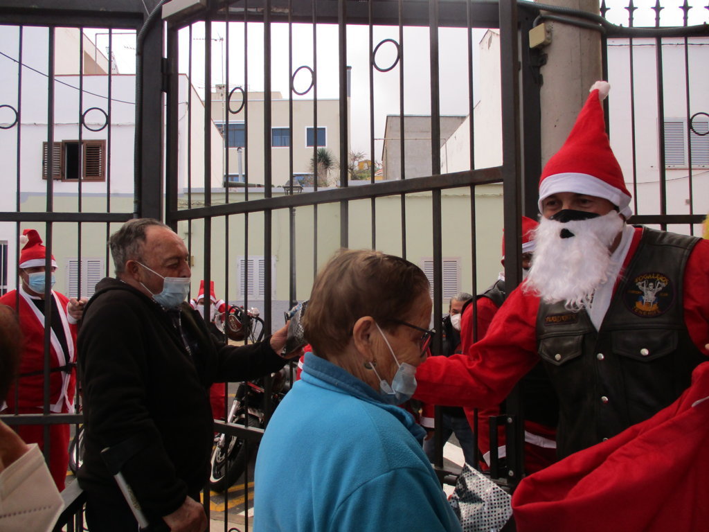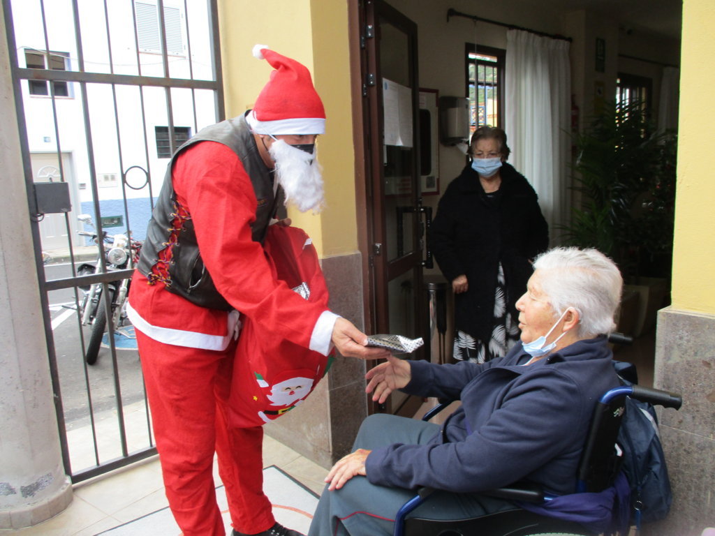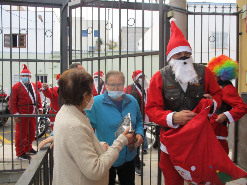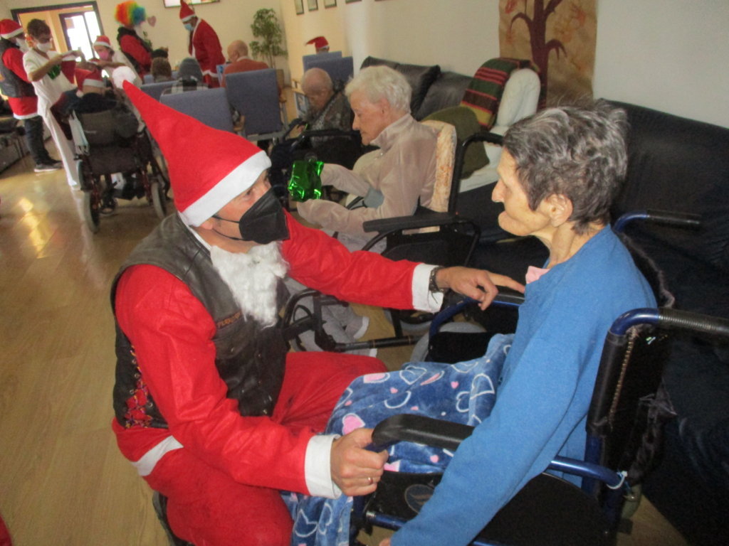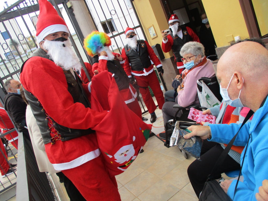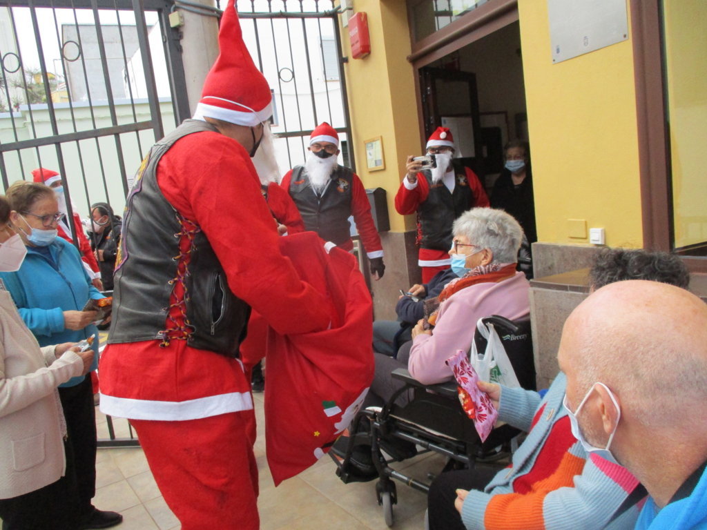 El grupo de moteros llamado "Los Fogaleros" han acudido al centro haciendo bastante ruido con sus motos, vestidos de Papá Noel para hacer entrega de unos detallitos para cada uno de los usuarios y usuarias que forman parte de esta comunidad, incluso a cada trabajador y trabajadora.