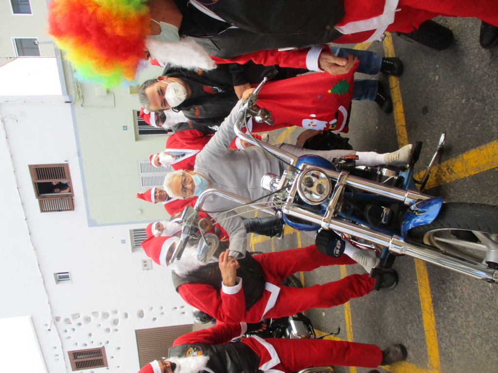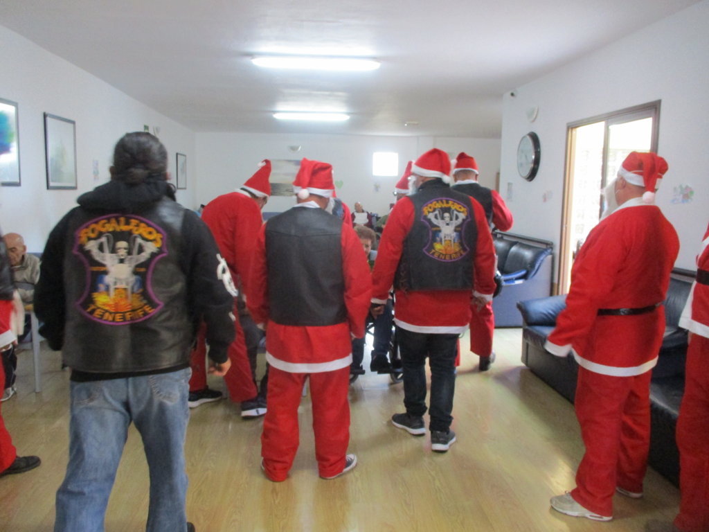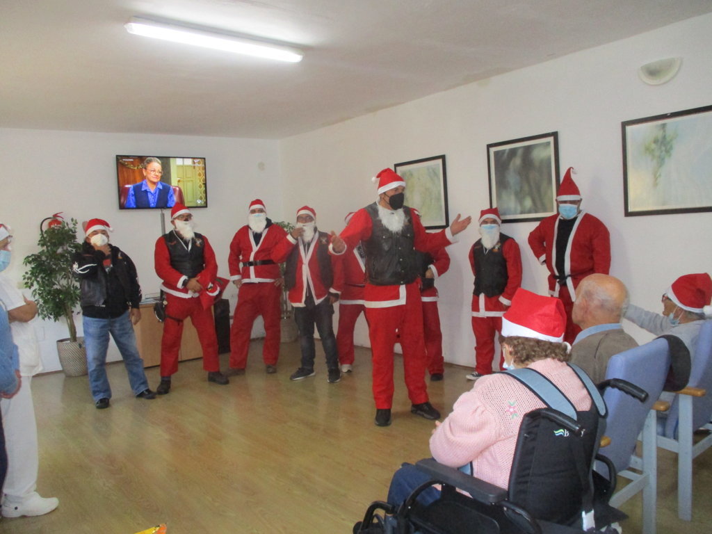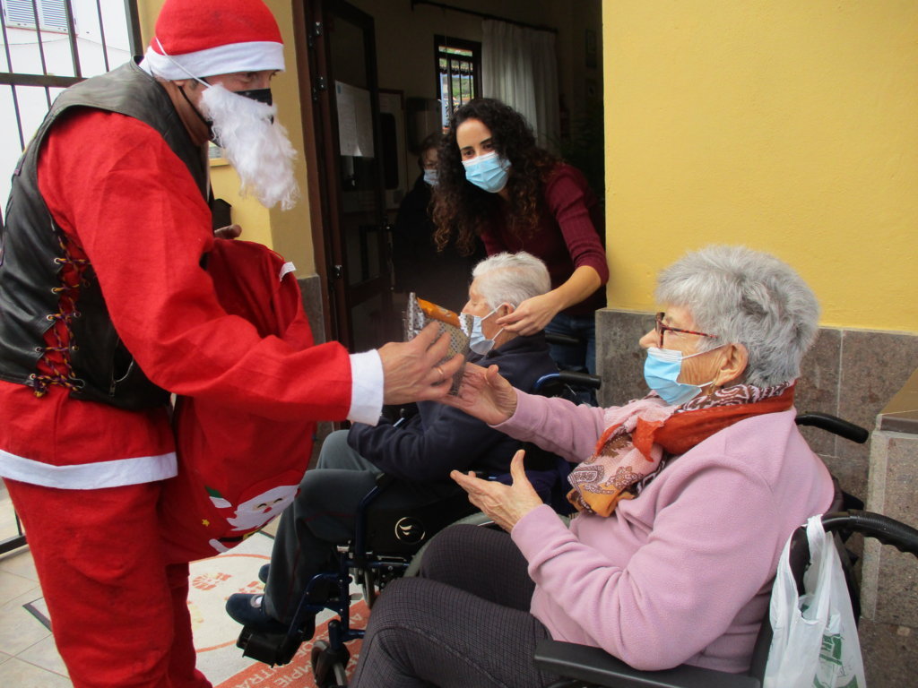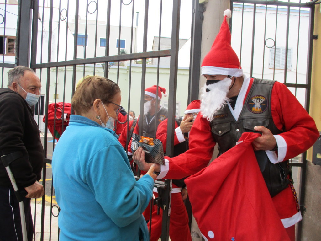 El grupo de moteros llamado "Los Fogaleros" han acudido al centro haciendo bastante ruido con sus motos, vestidos de Papá Noel para hacer entrega de unos detallitos para cada uno de los usuarios y usuarias que forman parte de esta comunidad, incluso a cada trabajador y trabajadora.