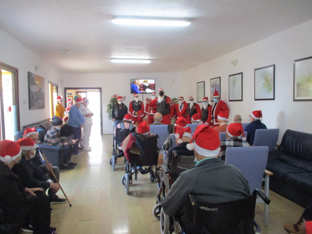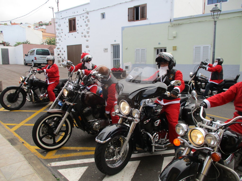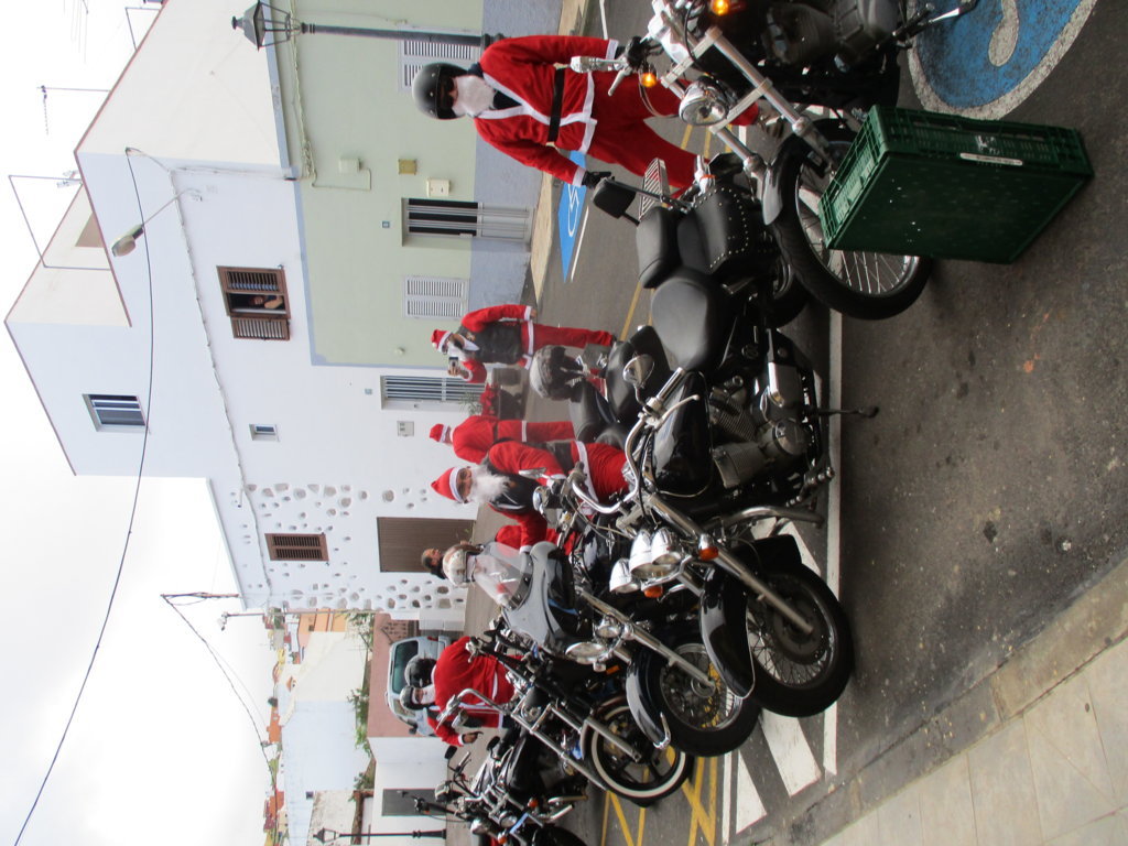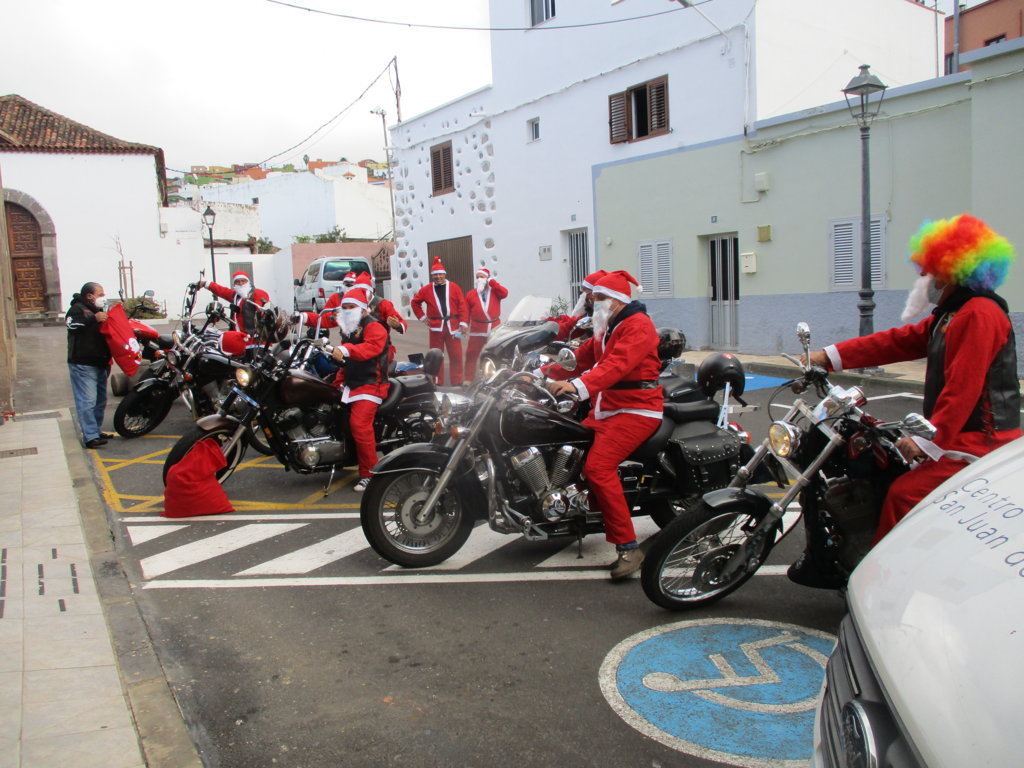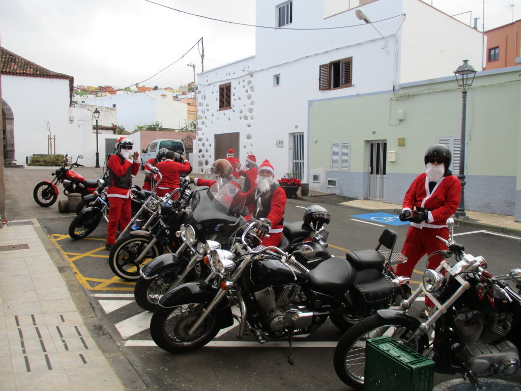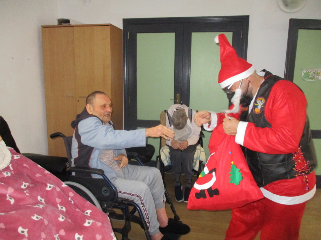 El grupo de moteros llamado "Los Fogaleros" han acudido al centro haciendo bastante ruido con sus motos, vestidos de Papá Noel para hacer entrega de unos detallitos para cada uno de los usuarios y usuarias que forman parte de esta comunidad, incluso a cada trabajador y trabajadora.