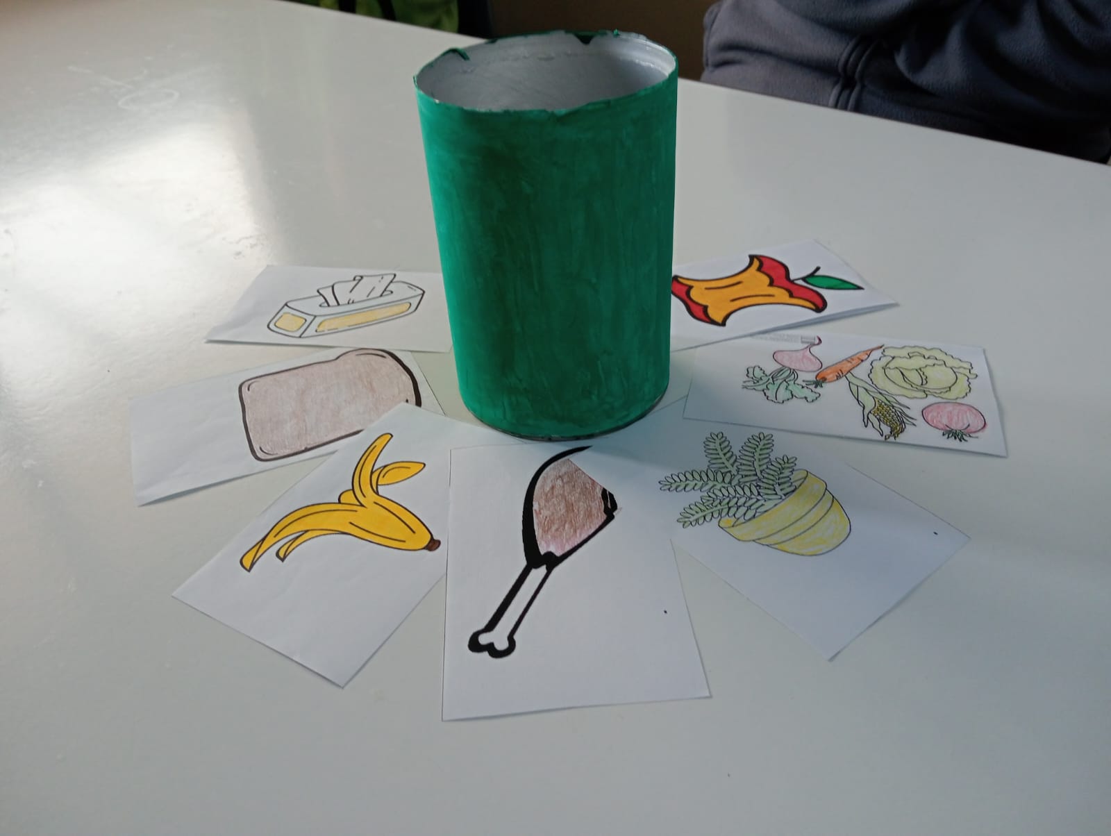 Durante una semana estuvieron coloreando unas fichas con alimentos, objetos y artículos, coloreando los "contenedores de la basura" y trabajando un poco con los conceptos de reciclar, reutilizar y reducir.