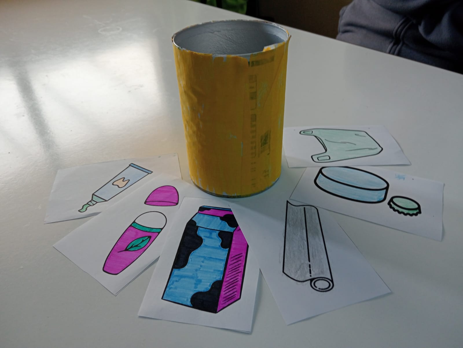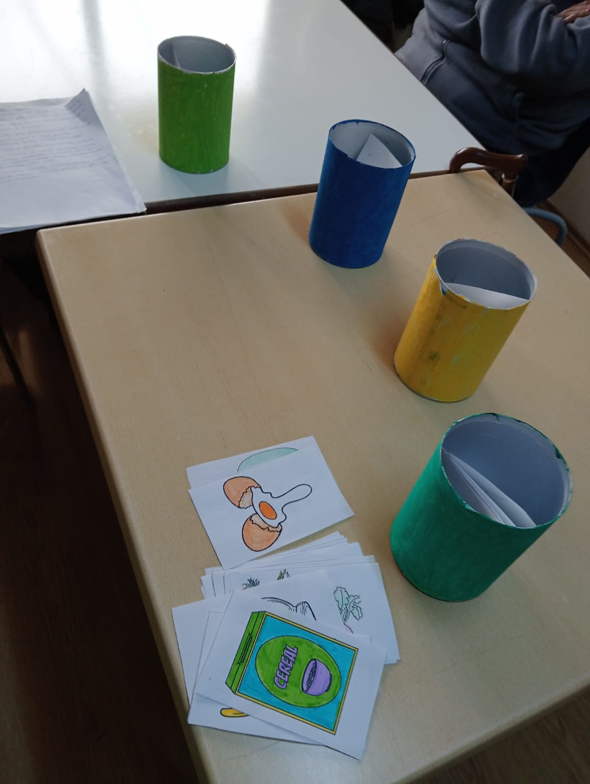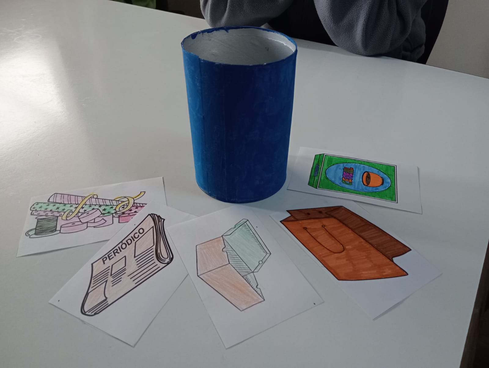 Finalmente, con todo lo trabajado en el taller, se realizó una actividad que consistía en colocar las diferentes fichas que habían coloreado dentro de los contenedores correspondientes.