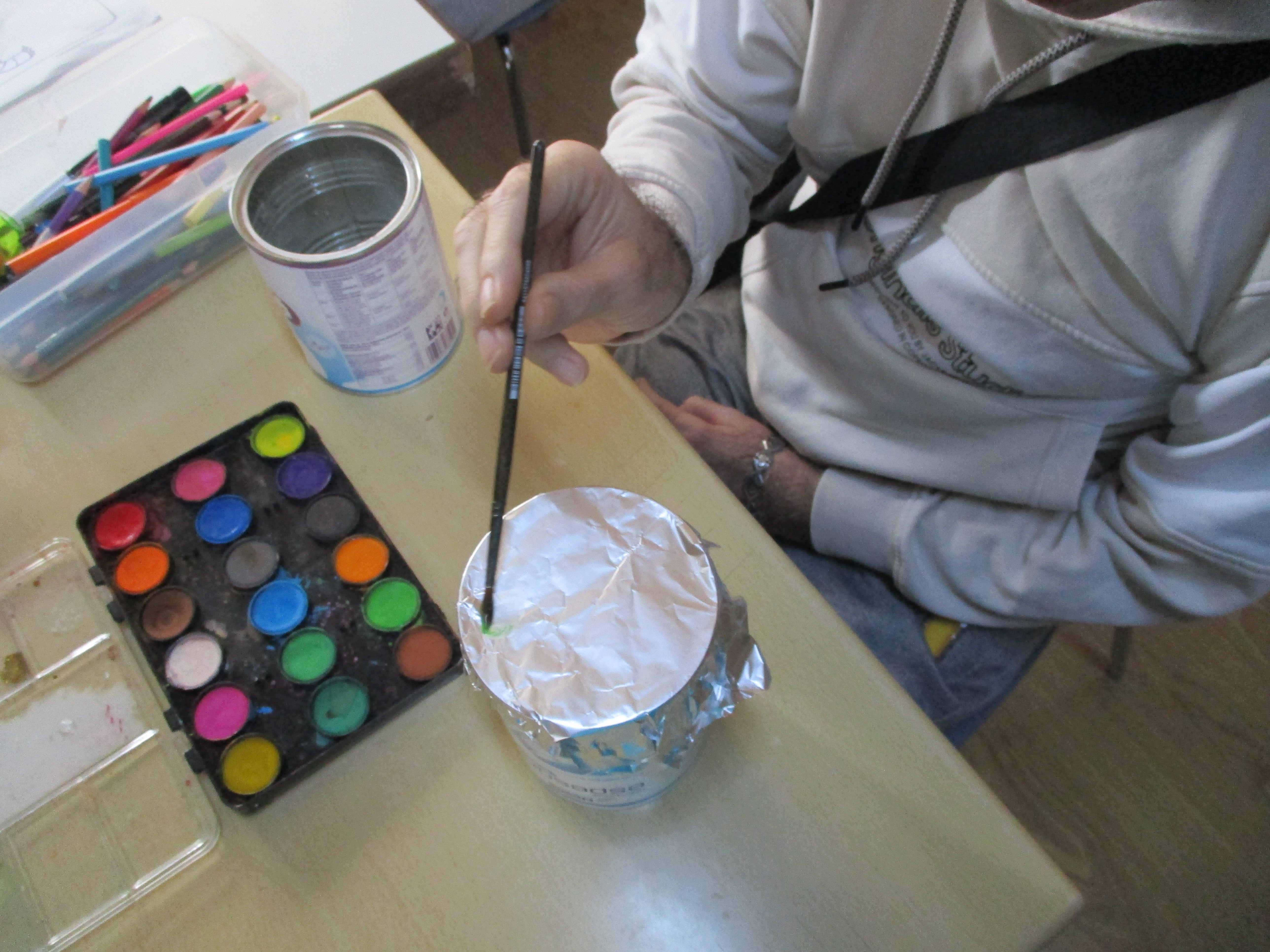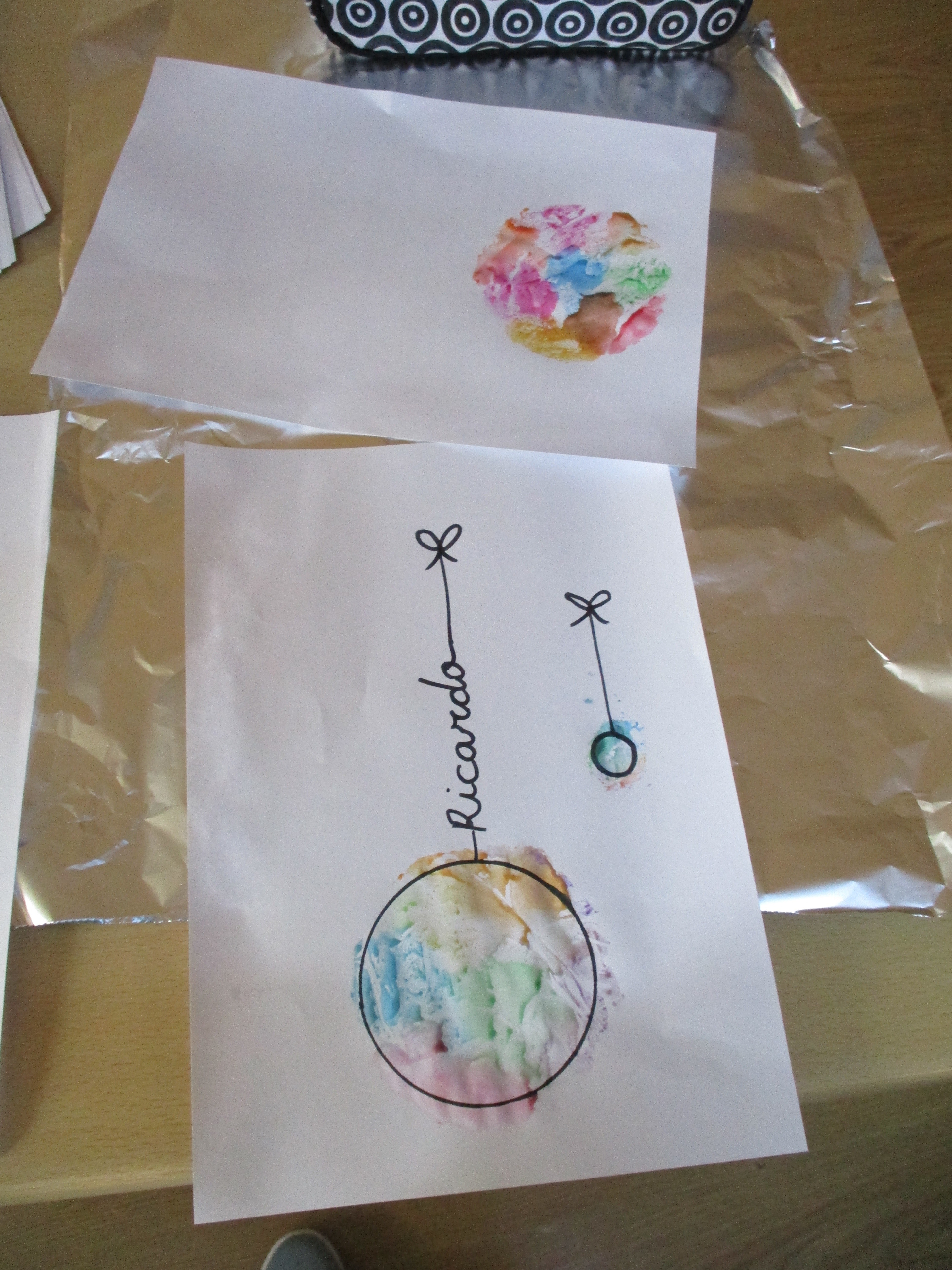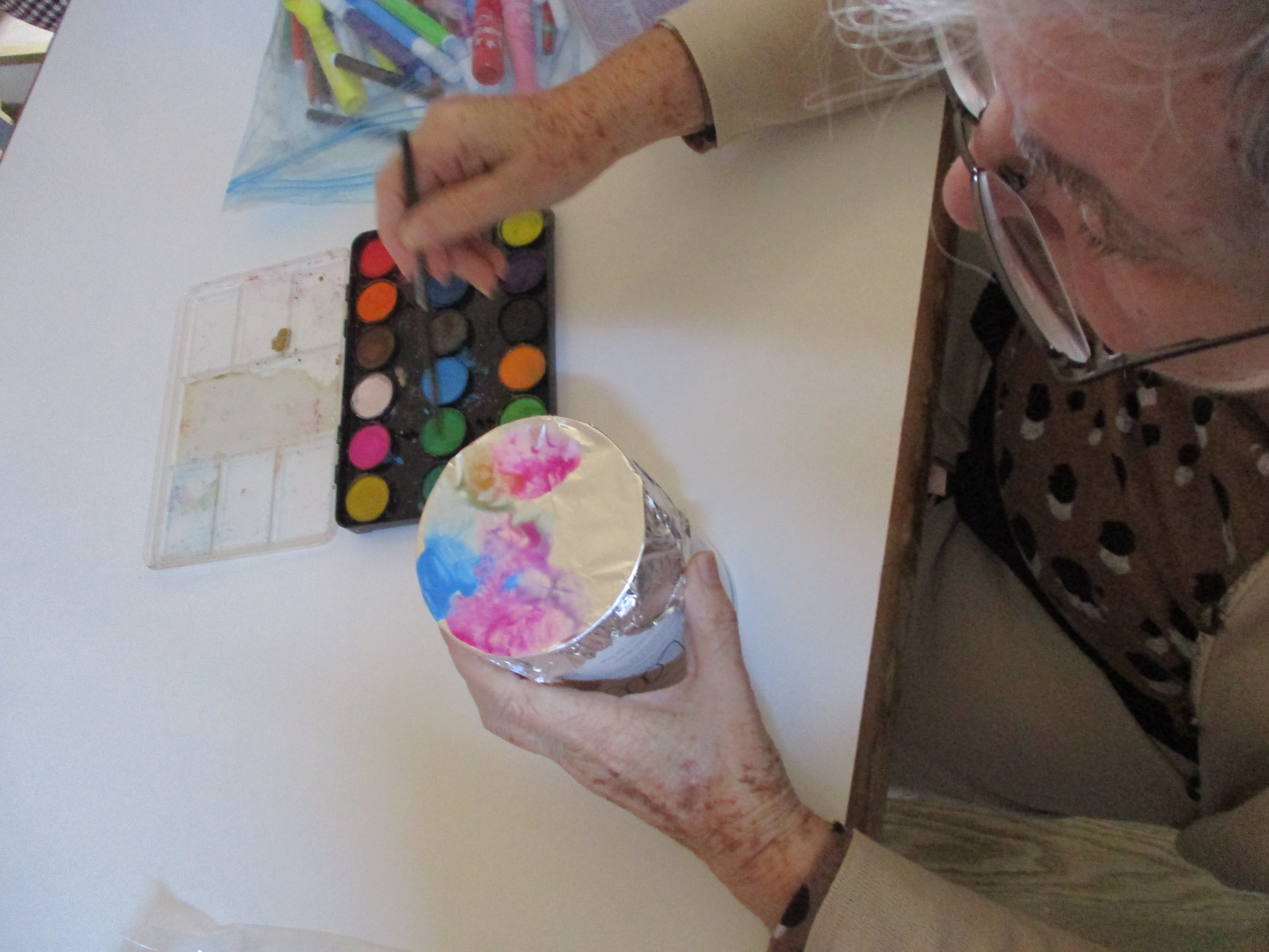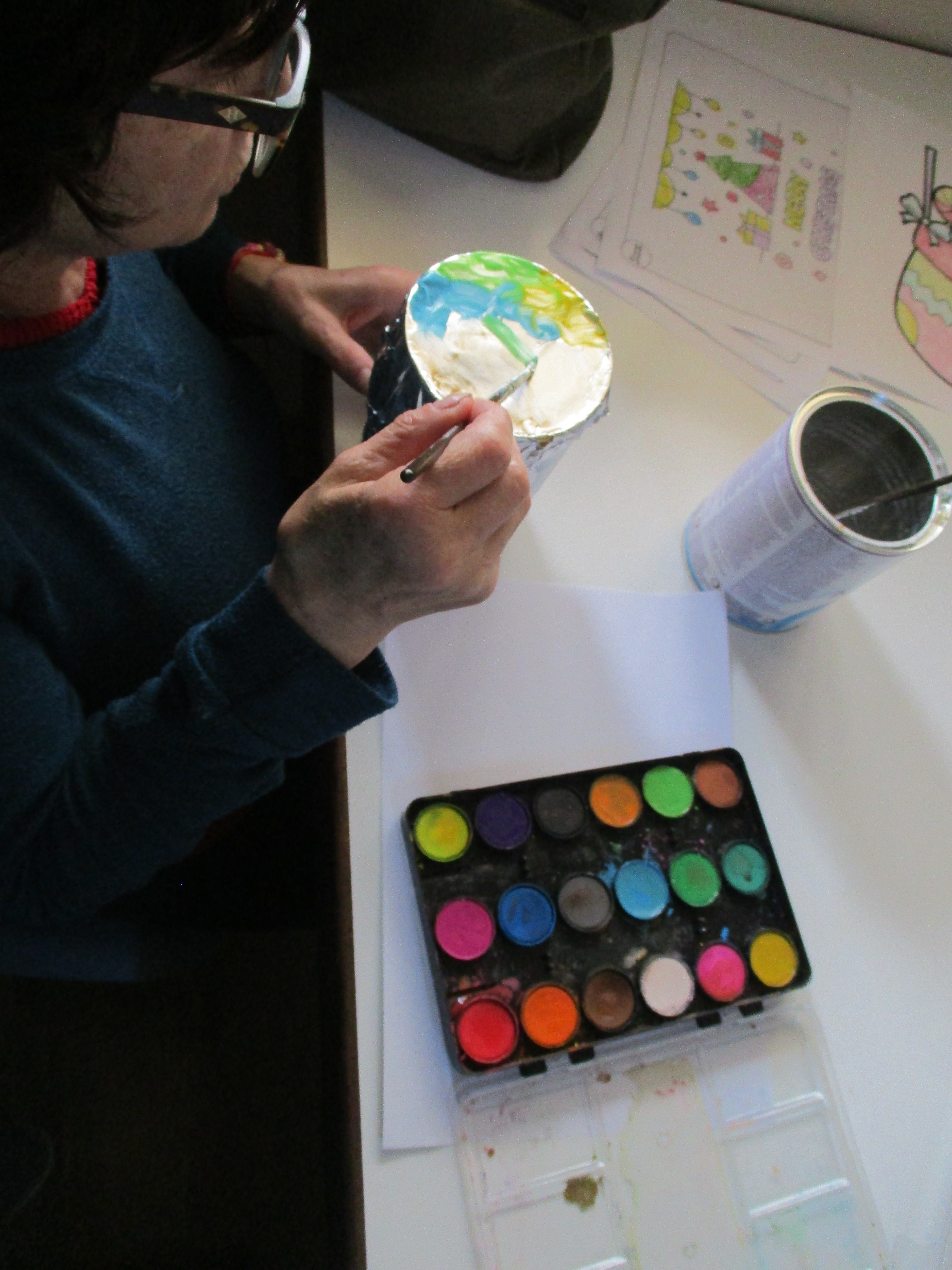 En esta ocasión, se aplicó acuarela en una cajita redonda, que luego se plasmó en un folio y se decoró con un lazo y el nombre de los usuarios/as del centro.