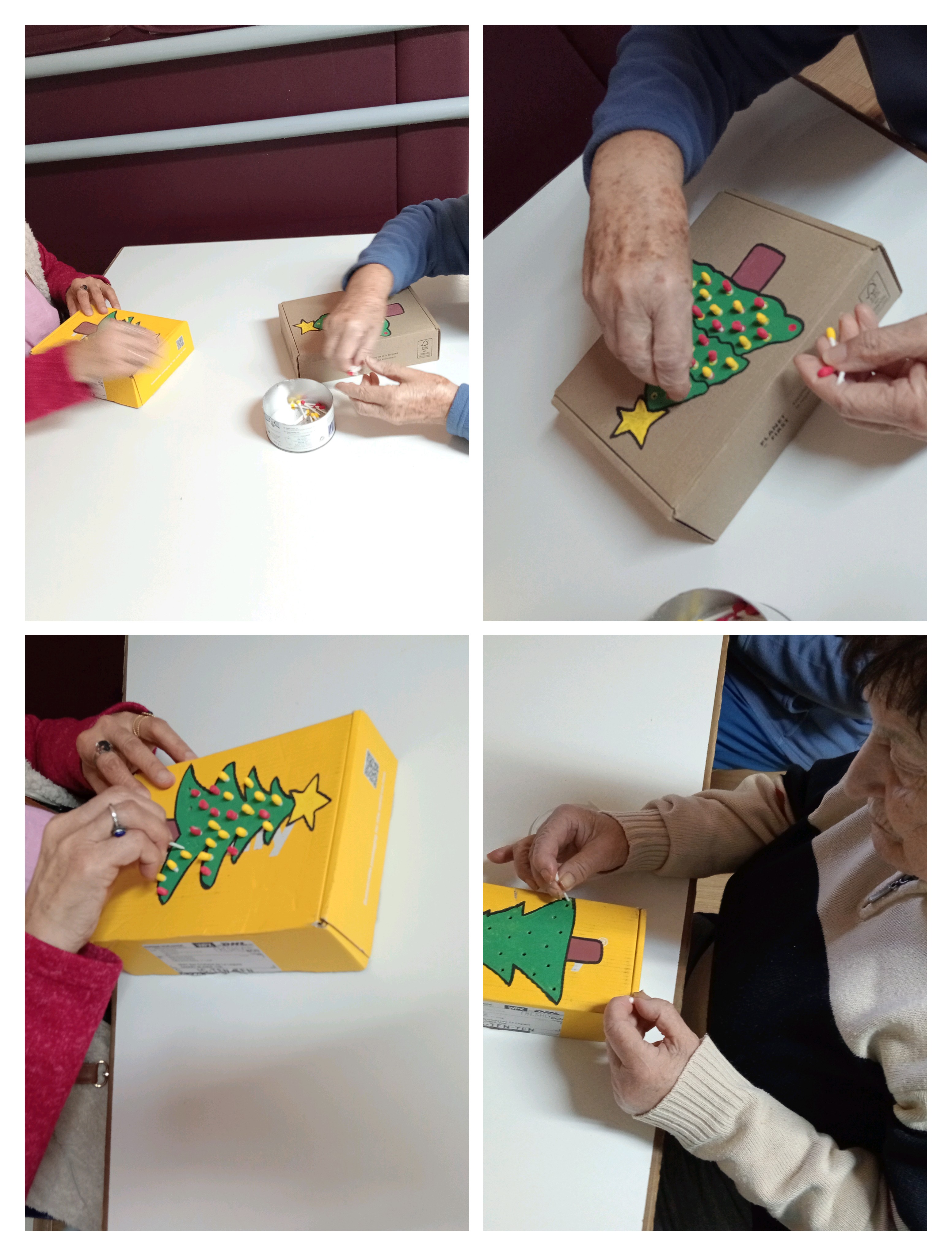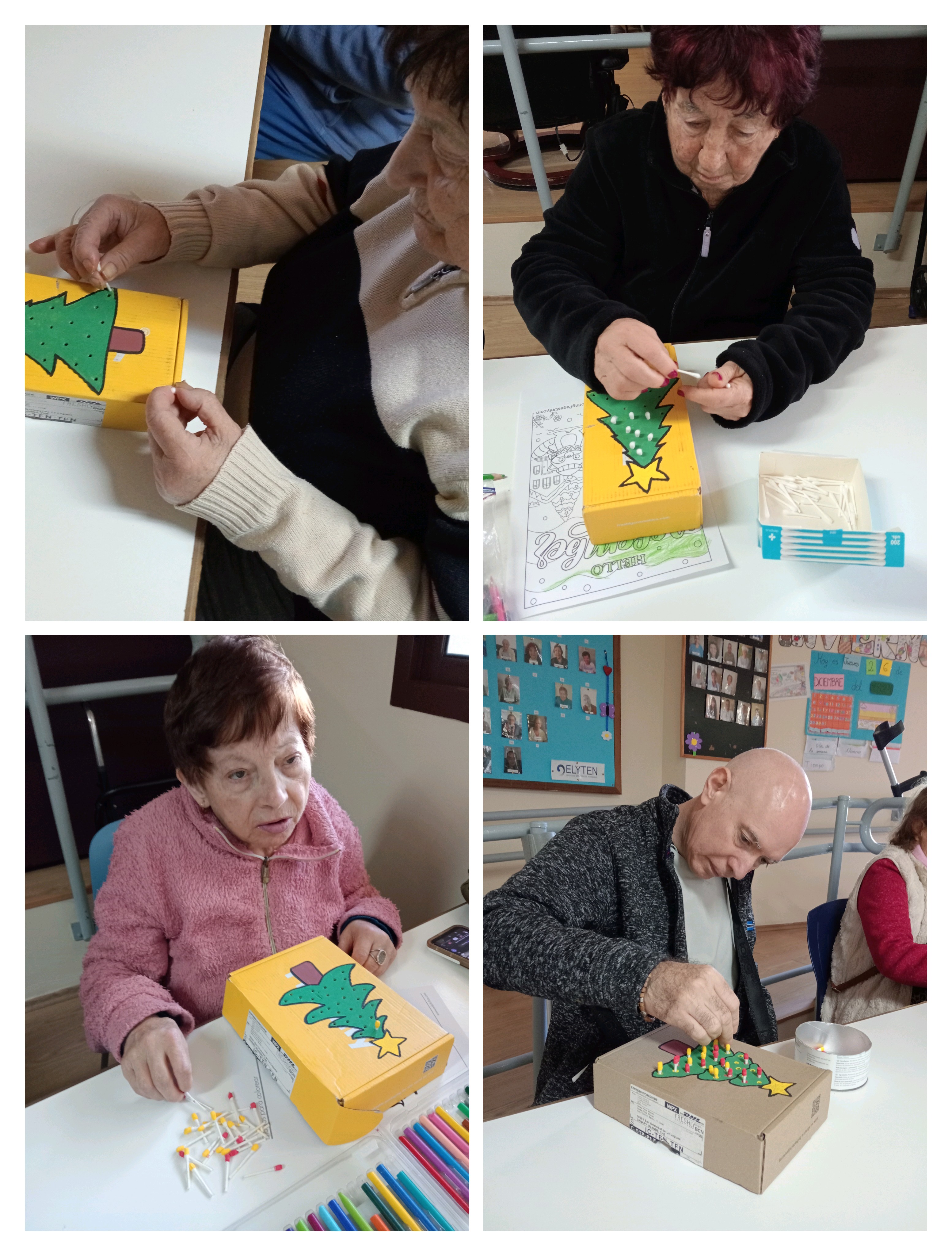 Hoy, los mayores del Centro Sociosanitario San Juan de La Rambla, ELYTEN han trabajado la psicomotricidad fina de una manera divertida y creativa. En esta ocasión, Claudia y Patricia guiaron a los usuarios en la decoración de unas cajitas con forma de árbol de Navidad, a las que les hicieron pequeños huecos para insertar bastoncillos.