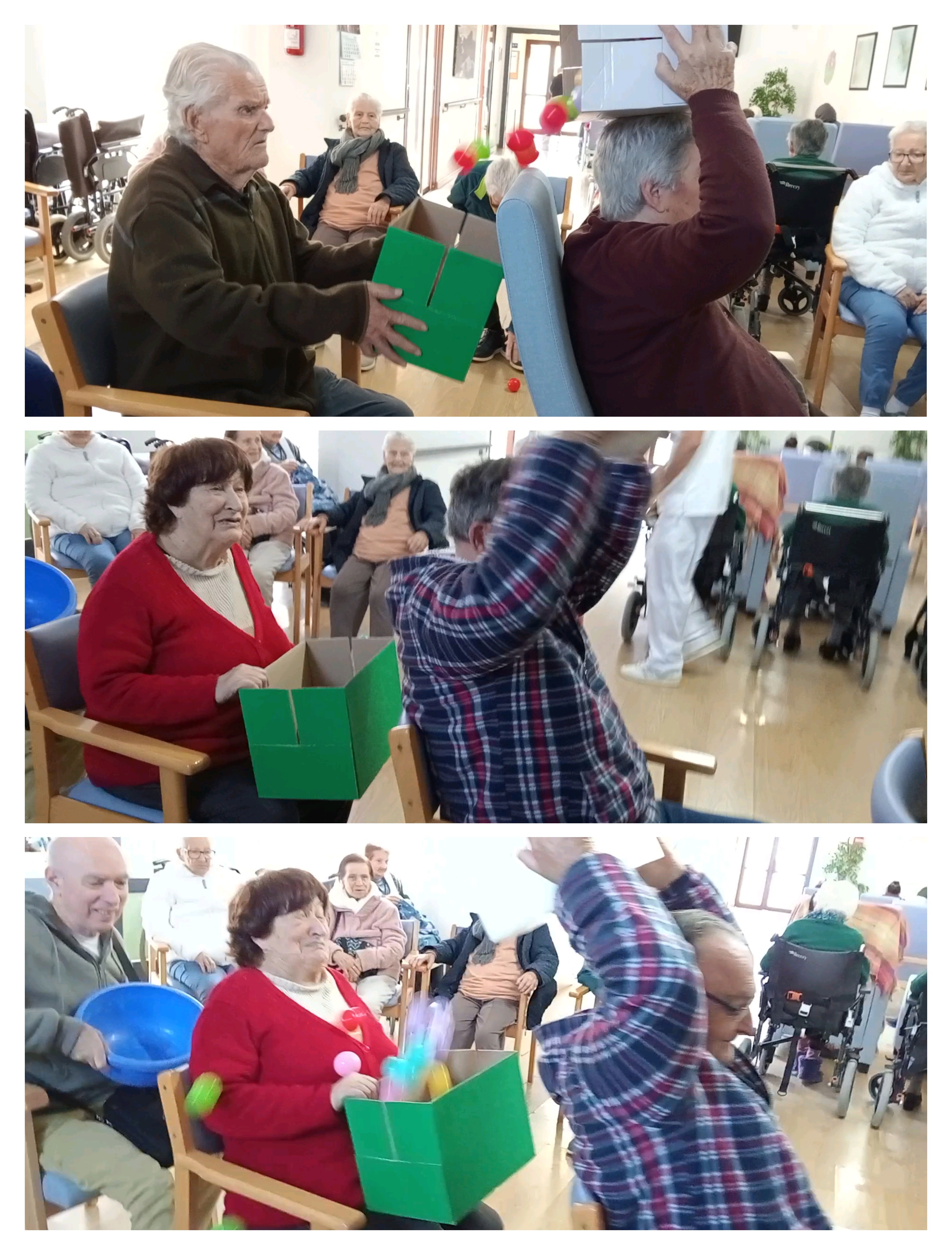 Sentados en filas de sillas, debían pasarse pelotas de colores lanzándolas por encima de la cabeza, de cesta en cesta, hasta llegar al último compañero, encargado de contar cuántas pelotas habían llegado correctamente.