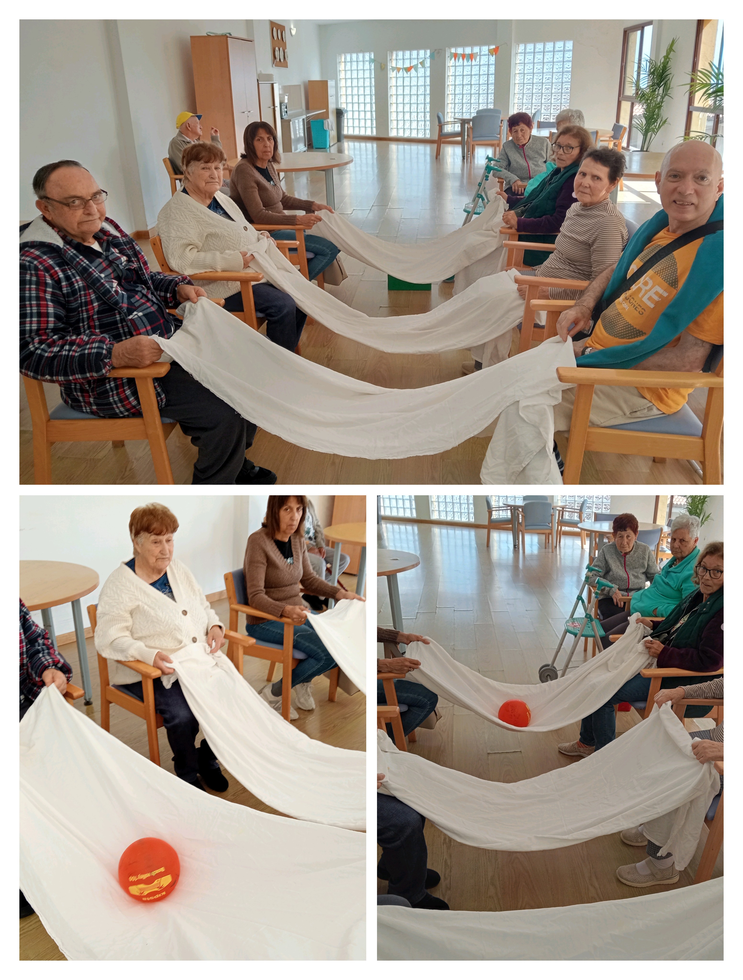 En una actividad tan original como entretenida, nuestros mayores participaron en un juego por parejas en el que, con la ayuda de una sábana, debían pasar una pelota de un extremo a otro del salón… ¡sin dejarla caer! Concentración, risas y mucha complicidad fueron los ingredientes principales mientras tensaban las sábanas y se pasaban la pelota con cuidado.