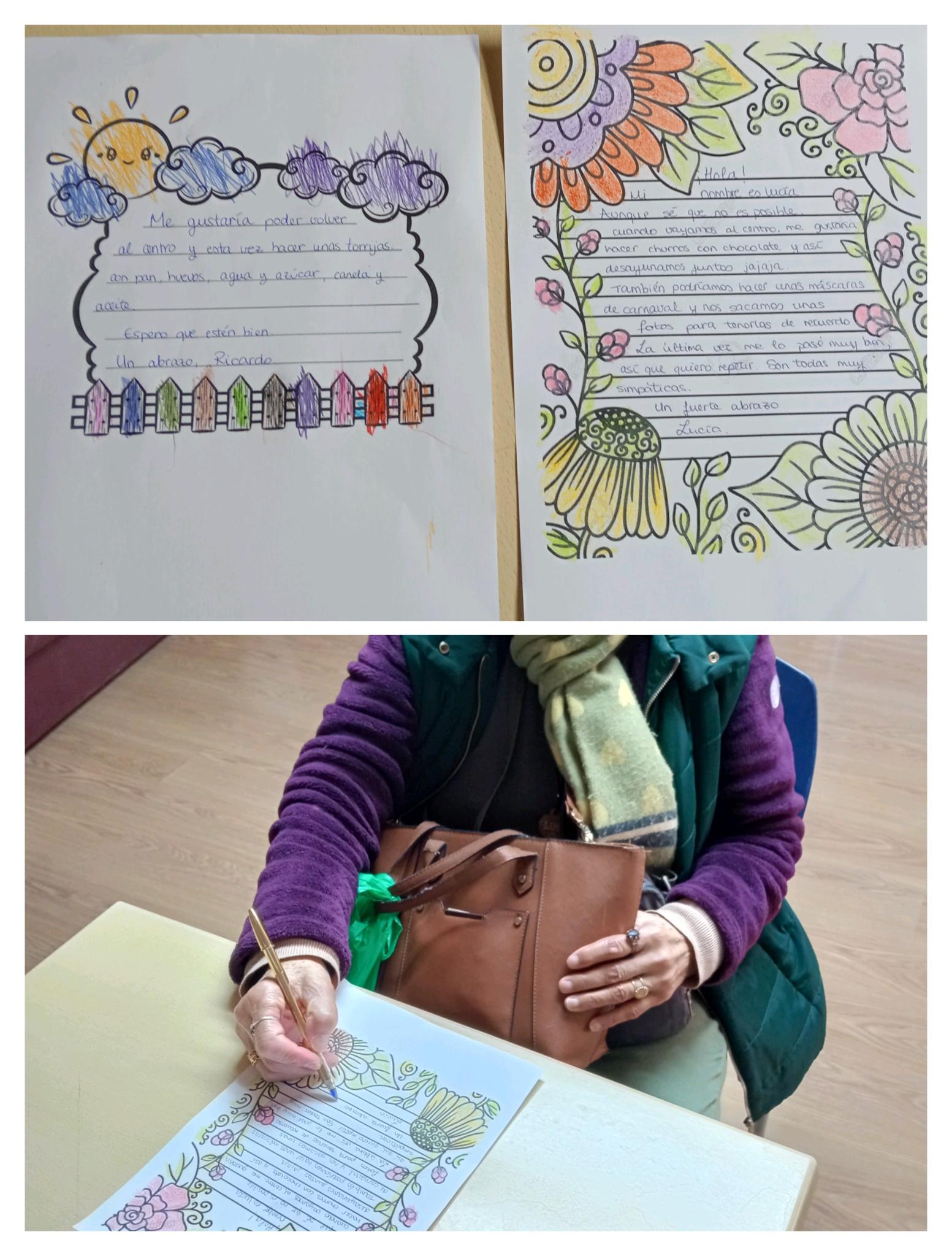 Nuestros mayores colorearon cartas, trabajando la motricidad fina y la atención, y compartieron mensajes cargados de recuerdos y buenos deseos, que fueron escritos respetando sus palabras y enviados al centro ocupacional con el que ya habíamos colaborado.